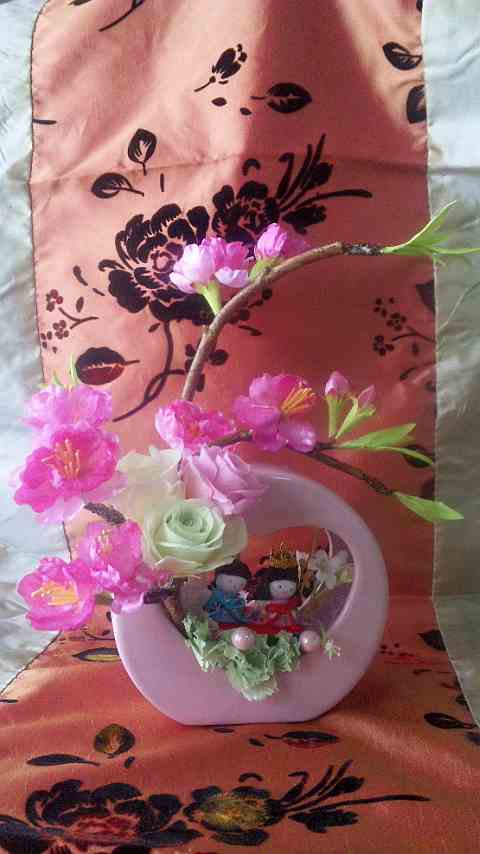 2月のレッスン お雛様 ウィンドハートの器に可愛い桃の花(アート)、パステルカラーのバラ、ミニカーネーションでアレンジしましょう。 \3800(器12×12)