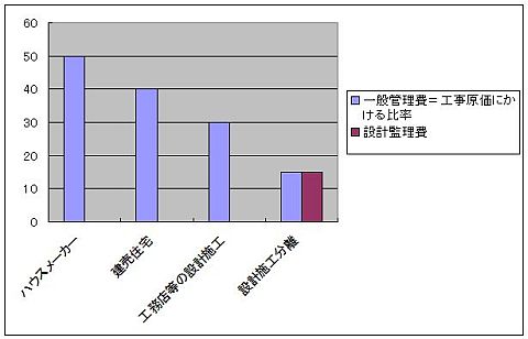 ◆ 建築工事費のしくみ建築工事費は大まかに、@直接工事費(工事原価)、A一般管理費、B消費税からなります。 @直接工事費(工事原価)とは、建物をつくるために直接必要とする費用で、材料費、施工費、現場管理費からなります。 またA一般管理費とは、工事施工にあたる企業の継続運営に必要な費用であり、管理費と営業利益からなります。 A一般管理費はハウスメーカー、建売住宅、工務店、設計事務所が行なうそれぞれの建築手法によって比率が異なります。 ハウスメーカーは工場生産により材料費が安くなるかわり、モデルハウスや広告費、人件費、社屋にお金がかかるのでA一般管理費の比率が高くなるわけです。 工事原価にかける一般管理費の比率は大体下図のようになります。