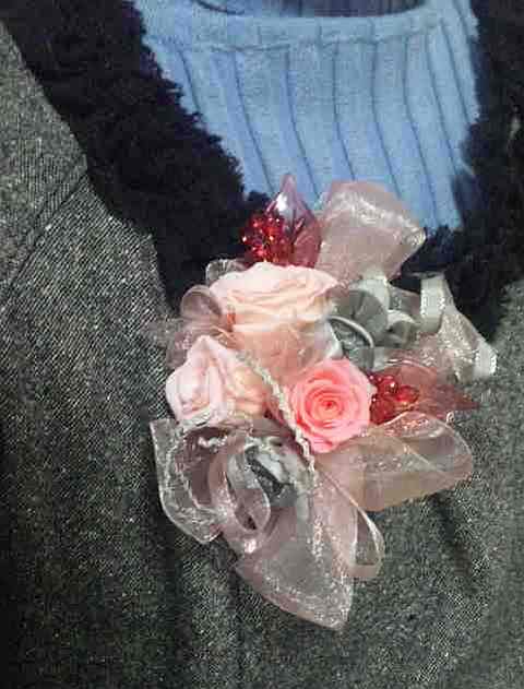 3月のレッスン コサージュ(クリアケ−ス付き)\3000 春先4月には、新しいスタート、お祝い、式など改まった機会、行事が多い月です。 お気に入りのひとつを作ってドレスアップのアイテムにしたり心を込めたプレゼントにしたりして楽しんでみませんか? ☆留め方 厚地のジャケットにもしっかり留まります。