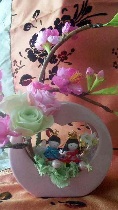 2月のレッスン お雛様 ウィンドハートの器に可愛い桃の花(アート)、パステルカラーのバラ、ミニカーネーションでアレンジしましょう。 \3800(器12×12)