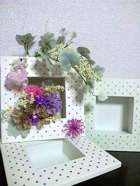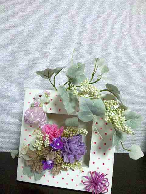 4月のレッスン カーネーションにドレッシーベアを添えて、優しく甘い香りを届けましょう。\4200 ドットウォールフレ−ムは置いて、立て掛けて、壁に掛けてと3タイプです。 ☆ロゴ入り(母の日)ピックも用意してあります。